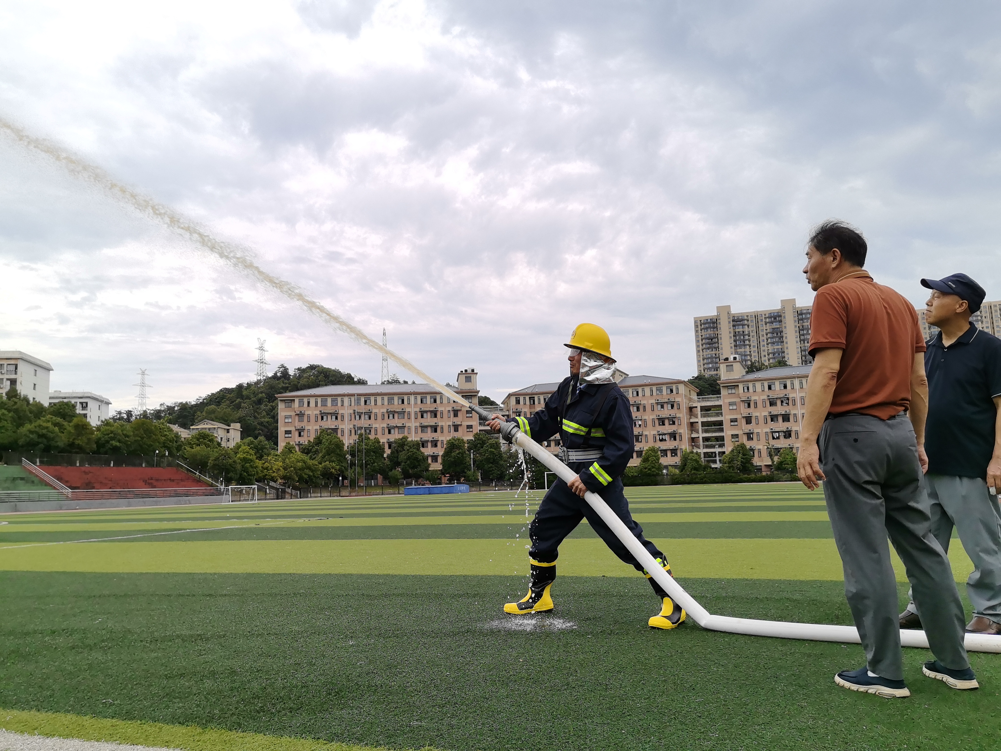 理论学习结束后,支部将活动延伸至实践一线,在学校田径场开展“红色先锋·安全卫士”党员消防安全演练。支部党员进行室外消火栓实操训练,通过模拟火情处置、水带连接、协同灭火等环节,进一步提升应急处突能力,以实际行动践行“安全卫士”的使命担当。