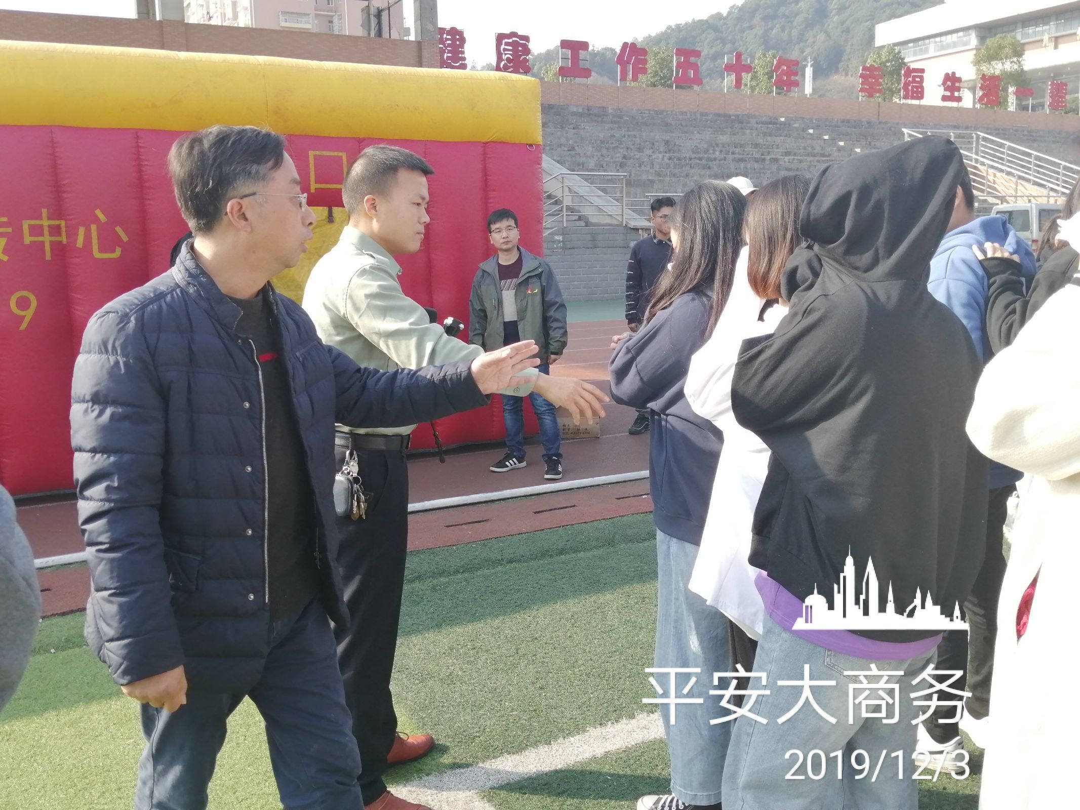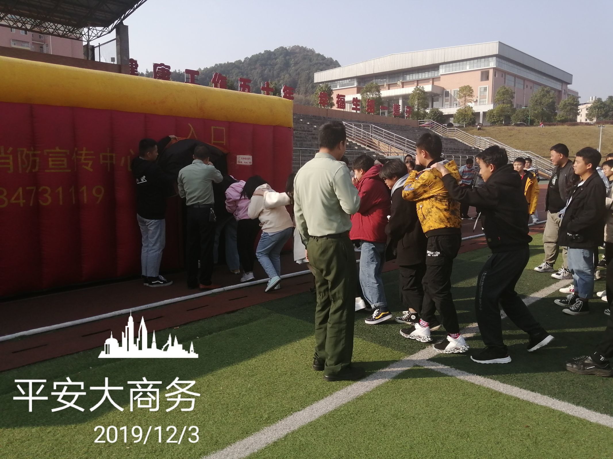12月3日学校在田径场开展了消防逃生演练,专门请消防员叔叔搭建了一个帐篷,在帐篷里模拟各种紧急情况,教大家如果遇到紧急情况怎么逃生,