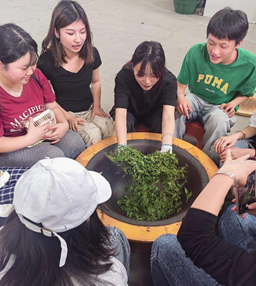 紧接着杀青,高温下的技艺较量。预热后的铁锅温度灼人,鲜叶入锅瞬间,"刺啦"声与茶香同时迸发。我们模仿师傅"抛、抖、闷"的手法,却因经验不足导致翻炒不均。在师傅指导下,逐渐掌握高温快炒的关键,手腕力度控制翻炒节奏,通过持续翻动让鲜叶均匀受热。当叶片变软、色泽转深绿时,我们才真正理解杀青对保留茶香、钝化酶活性的决定性作用。