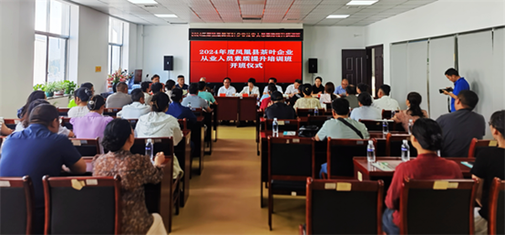 8月14日,湖南商务职业技术学院再度与凤凰县供销联社合作,在凤凰县惠农公司举行凤凰县2024年茶叶企业从业人员素质提升培训开班仪式。湖南商务职业技术学院院长李定珍教授,湖南省茶业协会秘书长王准、湘西州茶叶协会会长潘春新、湖南商务职业技术学院茶学院负责人、茶艺与茶文化专业教师团队成员和全体参培学员出席了开班仪式。