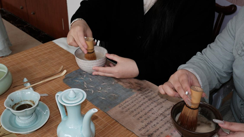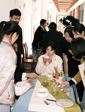 踏入活动现场,浓厚的文化氛围扑面而来,身着传统服饰的同学们各就各位,为大家呈现出一道道精彩的茶艺表演。在宋代点茶区域,表演者有条不紊地温盏、投茶、调膏,随后手持茶筅,如灵动的舞者般快速击拂。随着茶筅的舞动,茶末与水相互交融,泛起层层雪沫,宛如云雾缭绕。围观的师生目不转睛,被点茶这一古老技艺深深吸引,不时发出阵阵惊叹。