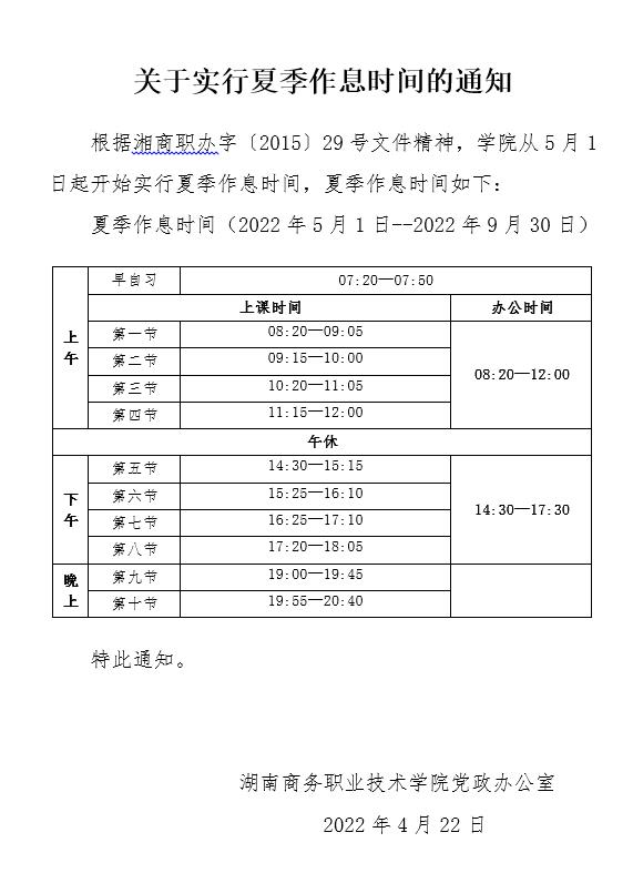 关于实行夏季作息时间的通知