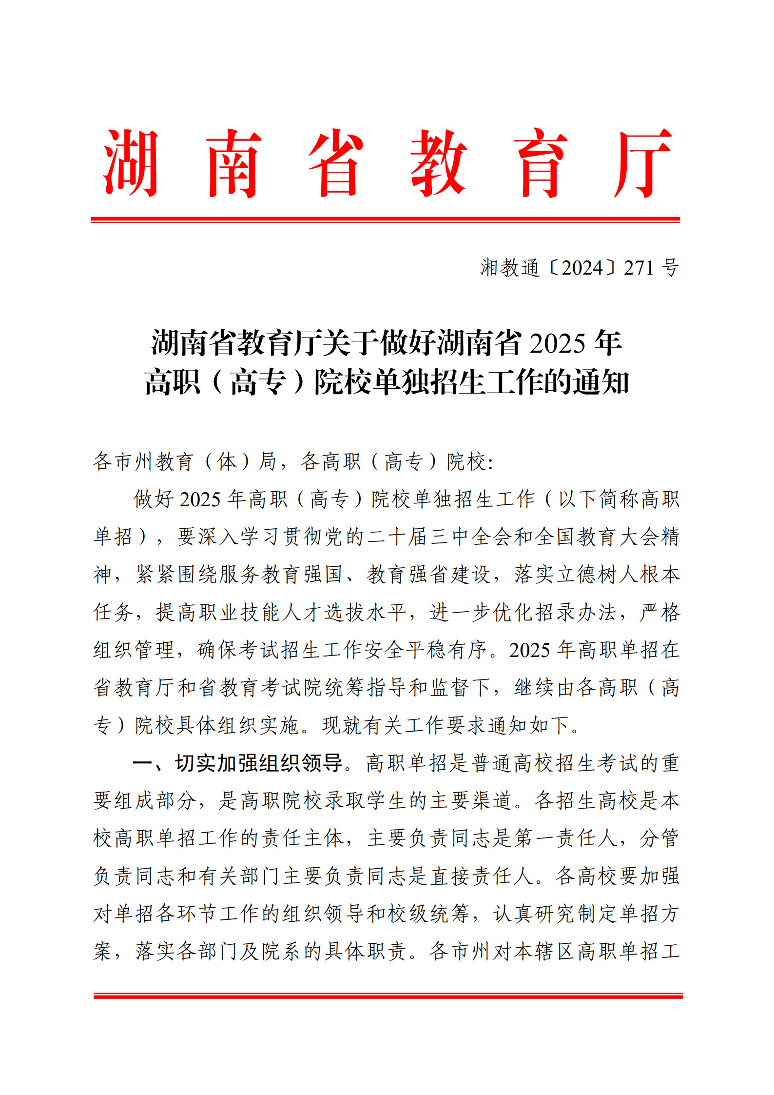 湖南省教育厅关于做好湖南省 2025年高职(高专)院校单独招生工作的通知