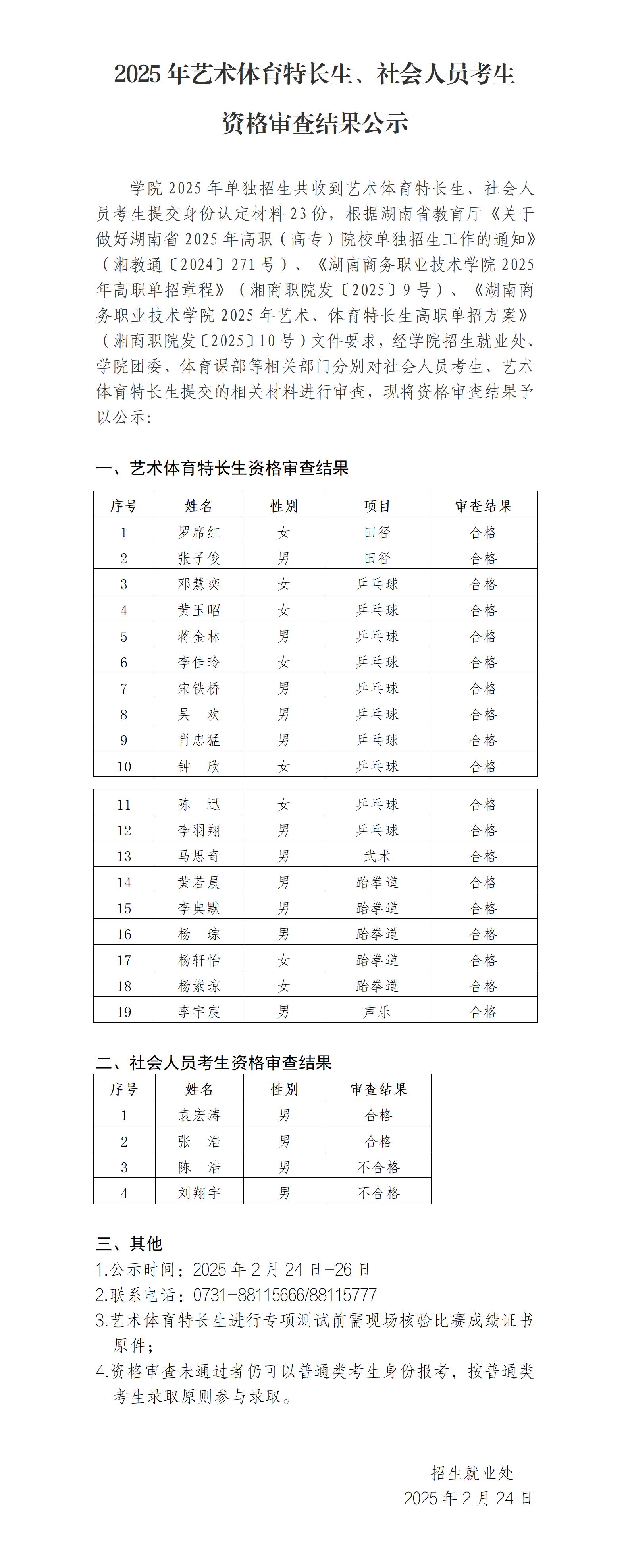 2025年艺术体育特长生、社会人员考生资格审查结果公示