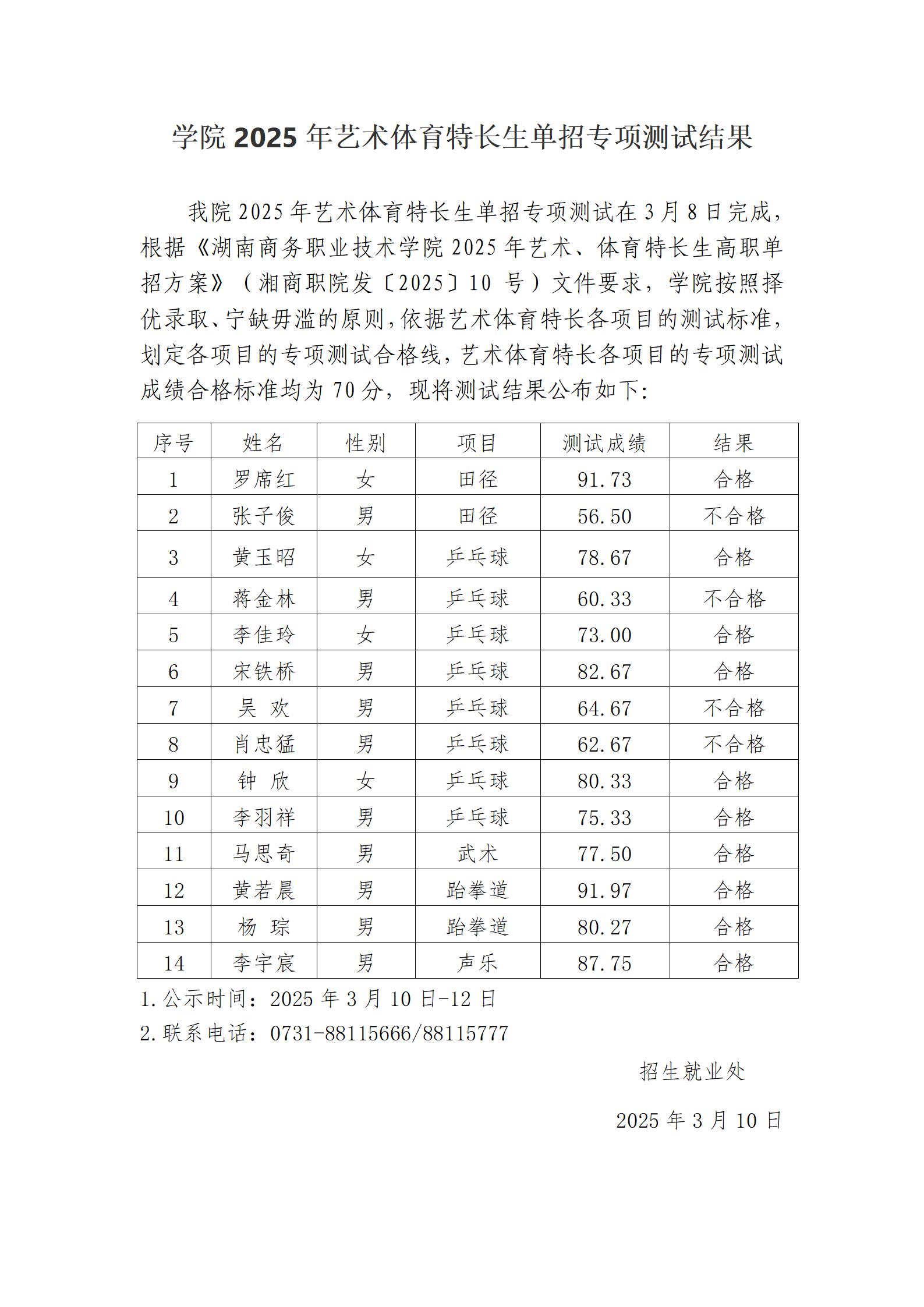 2025年艺术体育特长生单招专项测试结果
