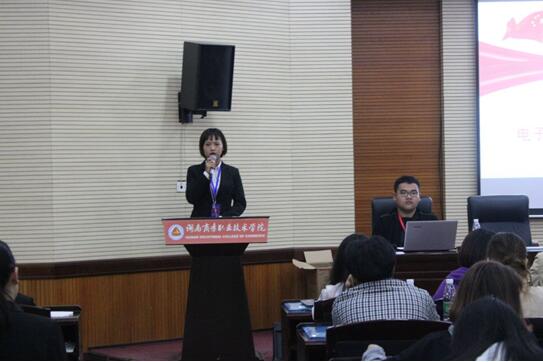 高宏华主席宣读大会开幕词:电子商务学院第一届团员代表大会应到学生团员代表76人,因部分班级实训原因大会实到代表70人,实到人数超过应到人数的五分之四,符合大会召开要求,并宣布大会开幕。