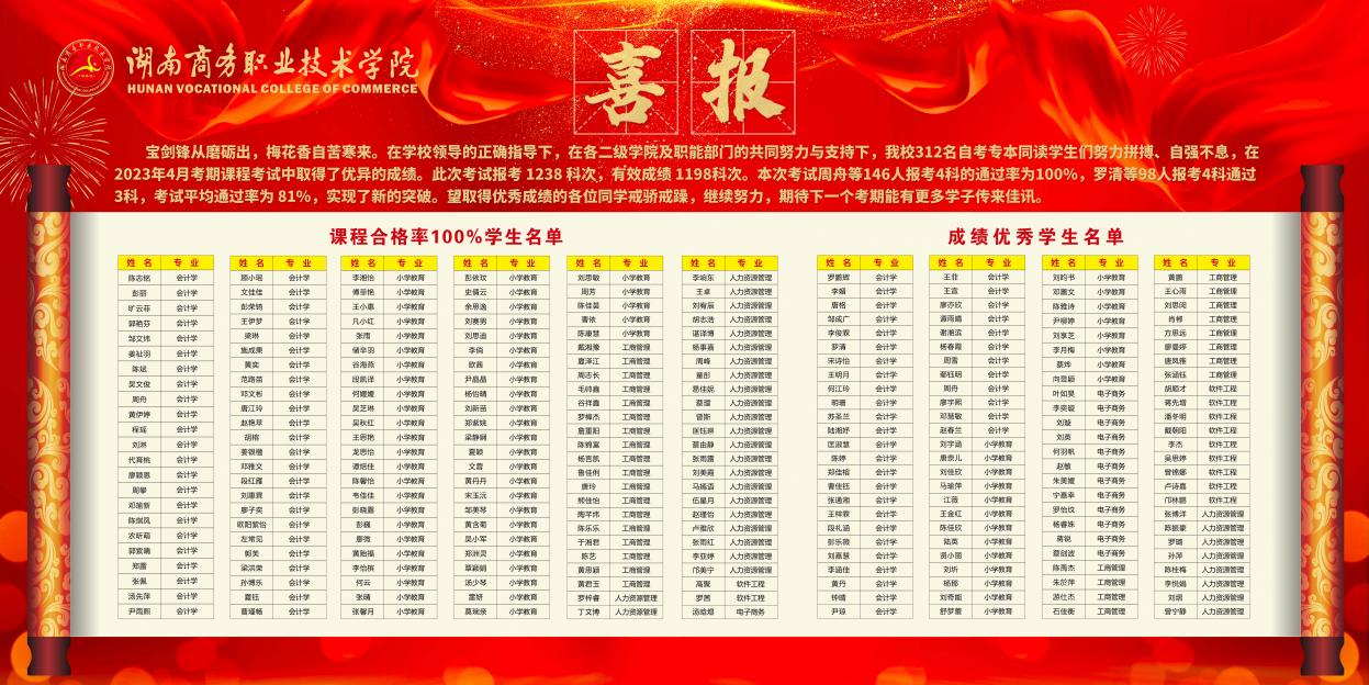 2023年4月份高等教育考试成绩于5月26日公布,电子商务学院自考本科班取得优异成绩,此次考试共有24人报名,总共报考96科,通过75科,平均通率78.1%,其中4科全部通过的学生有9人,3科通过的学生有12人。