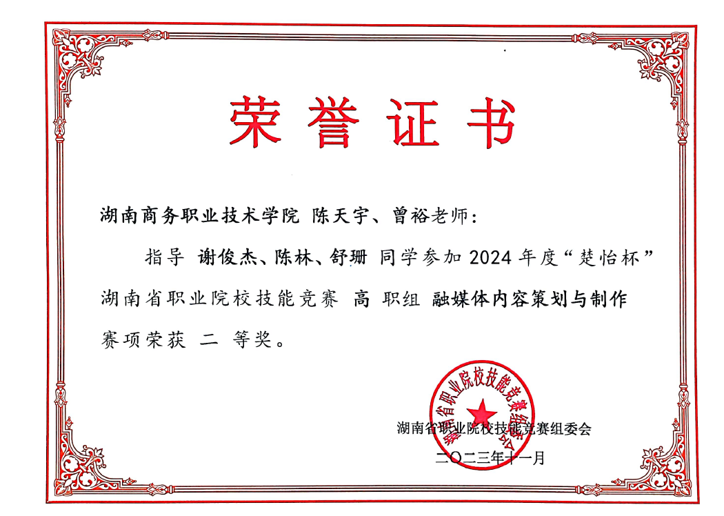 在12月2日结束的2024年度“楚怡杯”湖南省职业院校技能竞赛“融媒体内容策划与制作”赛项中,由农村电子商务专业陈天宇、曾裕老师共同指导的陈林、谢俊杰与舒珊参赛团队荣获湖南省二等奖。