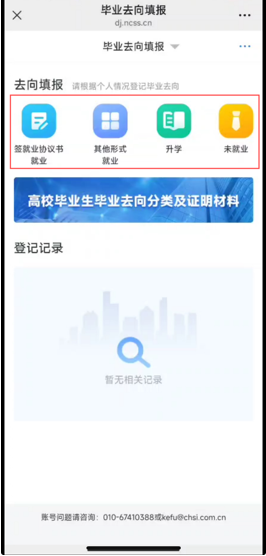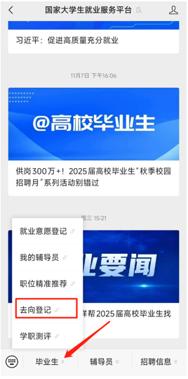 毕业生本人微信关注“国家大学生就业服务平台”公众号,点击“去向登记”登录。