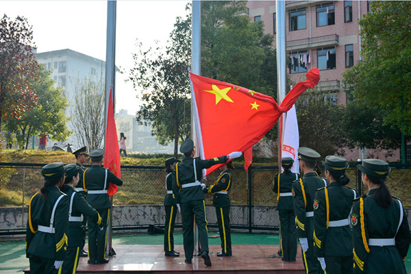 各代表队入场后,伴随着庄严而肃穆的国歌声,五星红旗在现场全体人员的注目下徐徐升起。当国旗在旗杆顶端迎风飘扬时,现场又响起激情昂扬的校歌《流金岁月》,校旗和会旗也在音乐中缓缓升起。