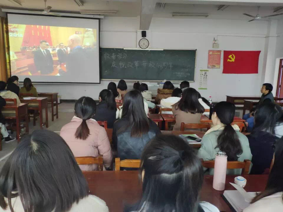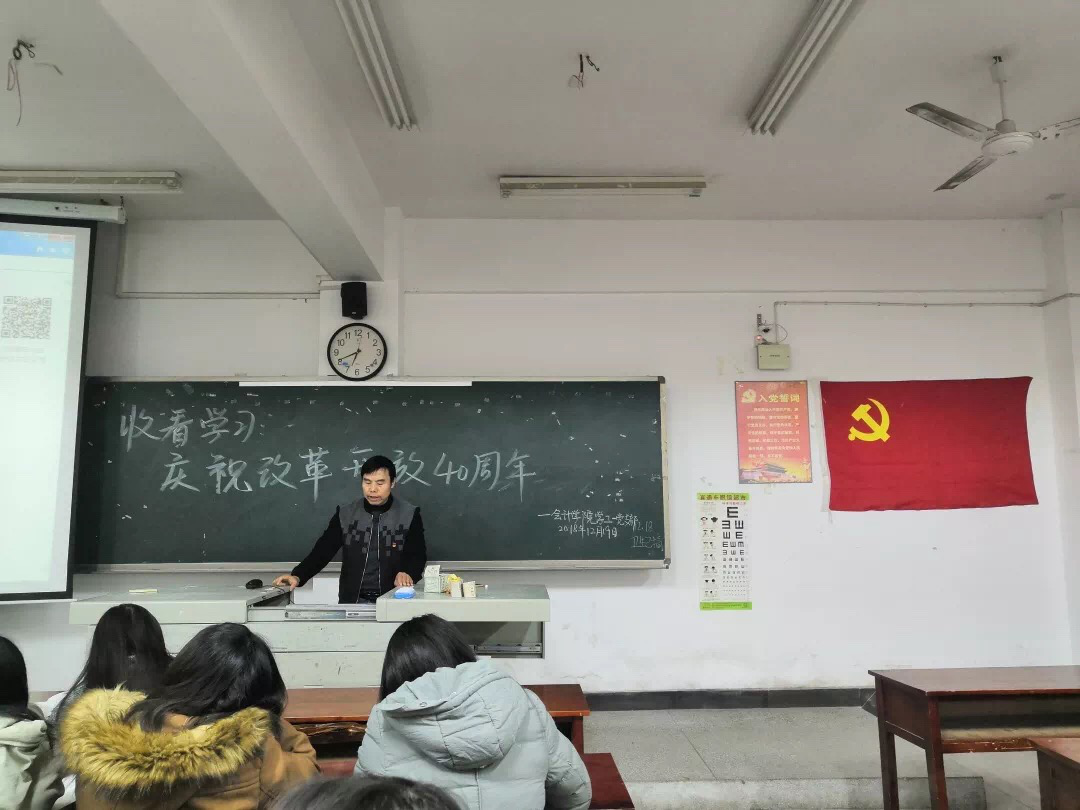 2018年12月19日中午12:30,会计学院学工一、二党支部学生党员在J2-201组织收看庆祝改革开放40周年大会。