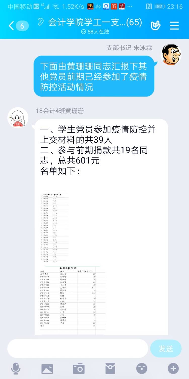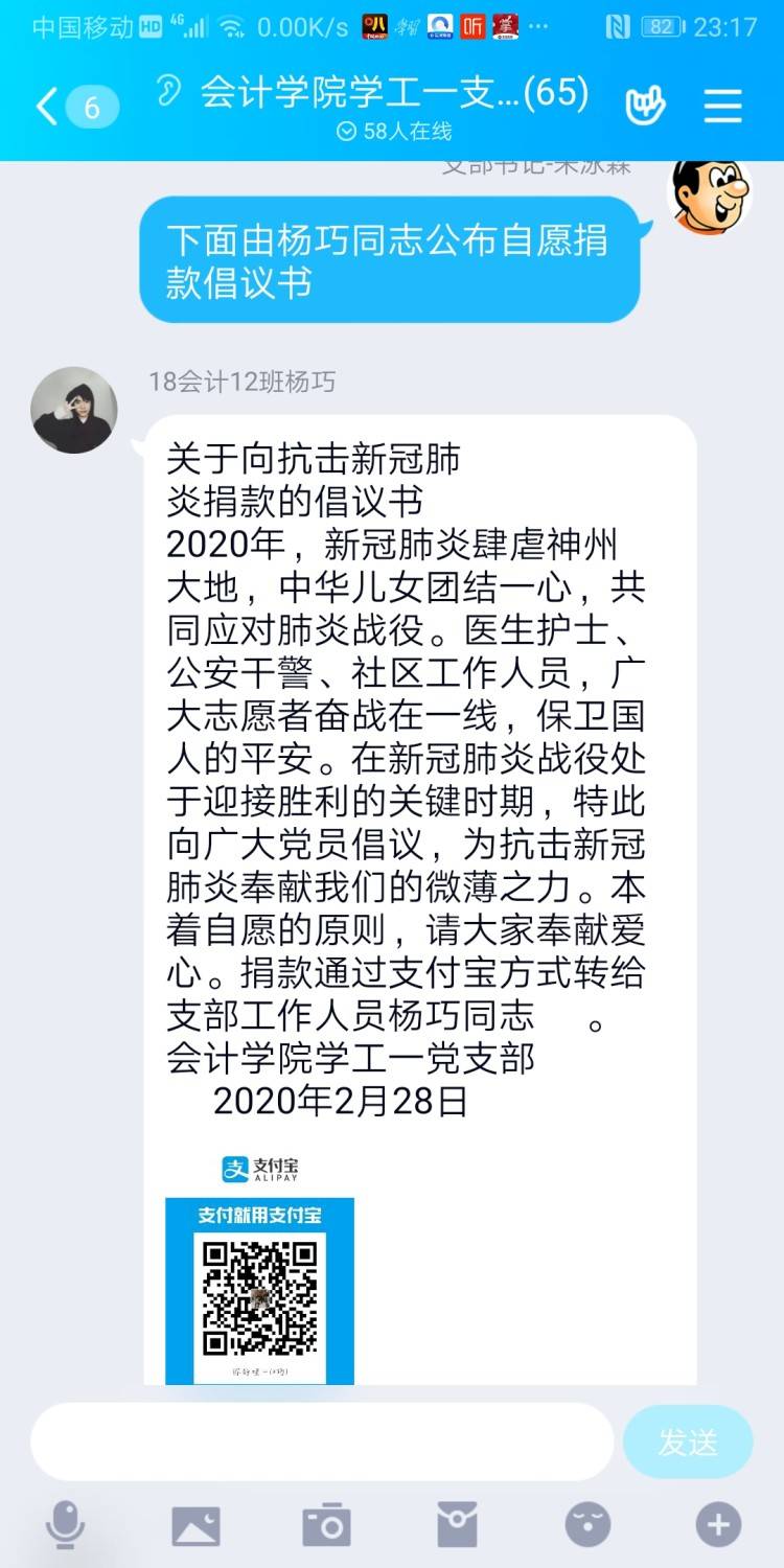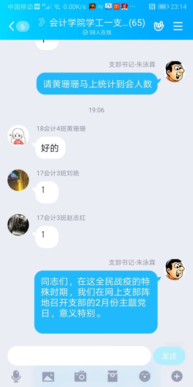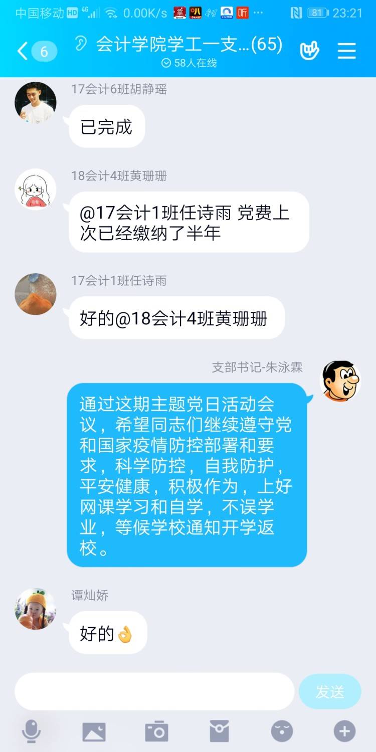 会计学院学工一党支部于2020年2月29日在支部QQ群里网上召开“我是党员我带头,疫情防控显身手”主题党日,参加本次会议的成员是会计学院学工一党支部全体成员,支部书记朱泳霖同志主持会议。 本次会议有以下几个内容: