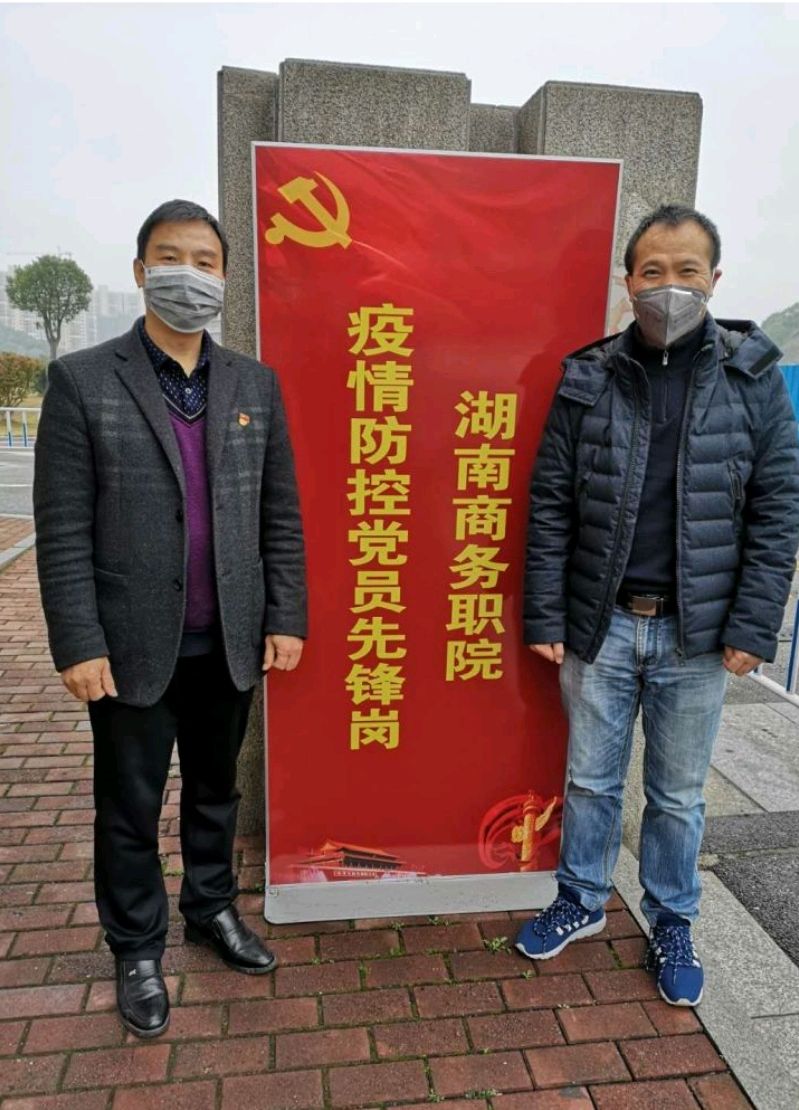 2020年2月28日会计学院学工一党支部党员石辉金同志和朱泳霖同志在学校参加疫情防控工作。