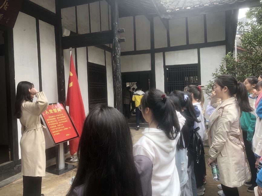 随后,大家又一起去往了新民学会旧址,当踏入悬挂着“沩痴寄庐”门匾的木门,寻访葱茏绿木掩映的“蔡和森故居”,那一段”恰同学少年,风华正茂,书生意气,挥斥方遒”的时光又浮现在眼前。学生党员代表谢华鑫同志带领大家重温了庄严的入党誓词,这不仅是重温决心和信念,对自己也是一种鞭策和激励。