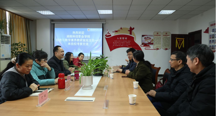 为促进校际间信息素养与数学课程教学经验交流,共同探讨新形势下数学与信息技术课程的教学改革与发展方向。2025年2月27日上午,湖南科技职业学院信息与数学素养教研室主任段琳琳一行来我校基础课部信息素养与数学教研室进行交流研讨。参加本次交流活动的人员有我校基础部主任吴玉光,信息素养与数学教研室主任黄芳,以及两校信息素养与数学教研室教师代表。