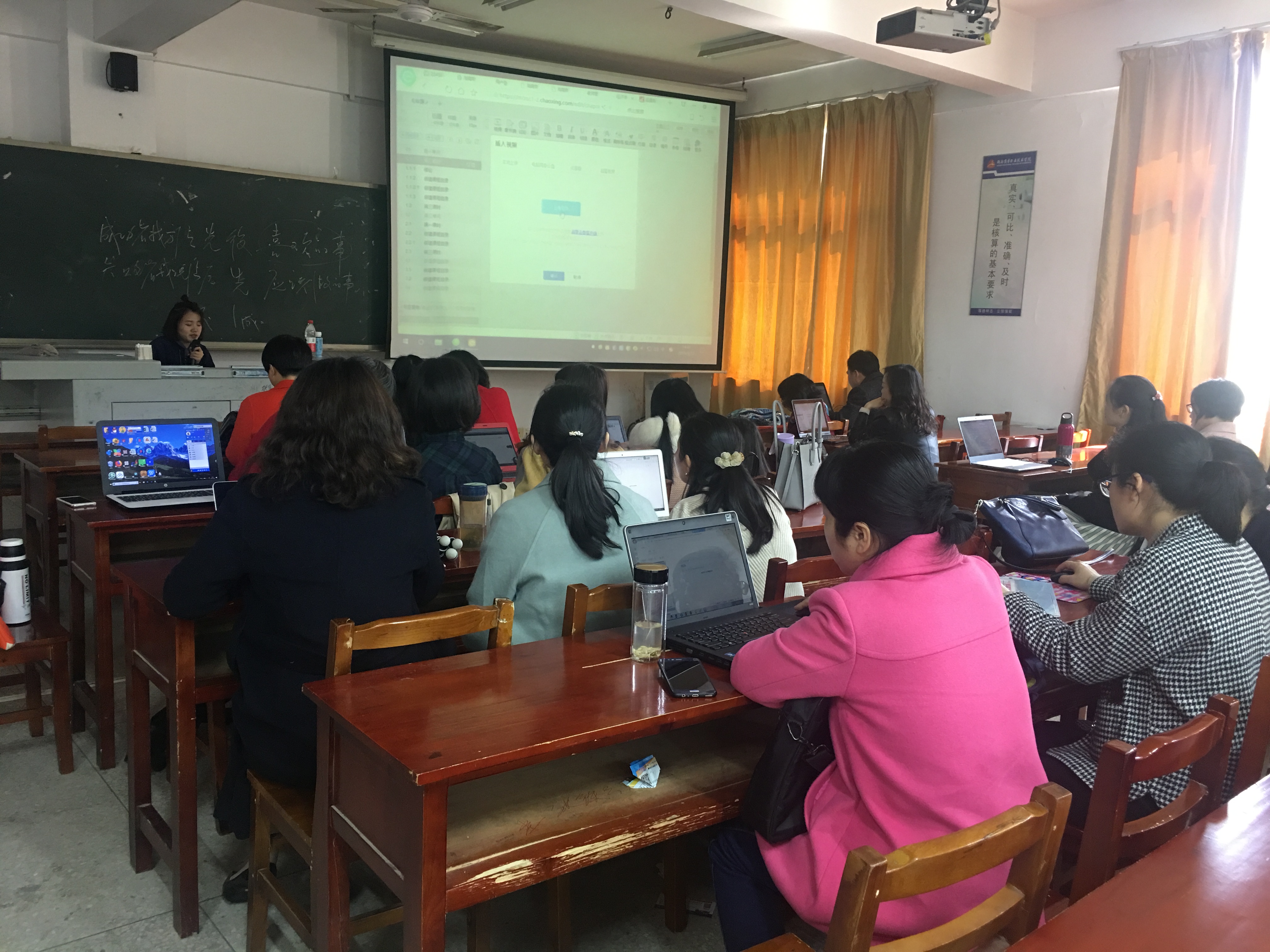 在培训会上,“超星公司”讲师向老师们详细介绍了,如何建立课程、创建班级,如何实现在线考勤、记录学生学习表现、作业统计、课件共享、成绩汇总、课程讨论、班级公告等功能,以及如何利用平台进行课后作业、课后讨论、课后考试以及课后阅读等,利用“超星学习通”有效进行师生互动和课堂管理,从而提高教学效果。