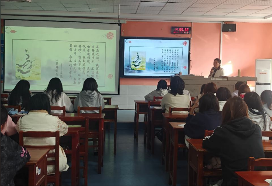 授课教师吴婷以屈原经典为文本依托,聚焦其象征体系与艺术手法的独创性价值。通过解析《离骚》中“江离”“秋兰”等香草意象从自然物到精神符号的升华逻辑,以及《橘颂》“以橘喻人”的咏物诗范式与“苏世独立”的人格映射,揭示了楚辞意象系统的深层意蕴;并通过《离骚》“不吾知其亦已兮,苟余情其信芳”等诗句,剖析屈原将个体命运与家国情怀交织的创作特质,彰显楚辞作为中国浪漫主义文学源头的独特魅力。