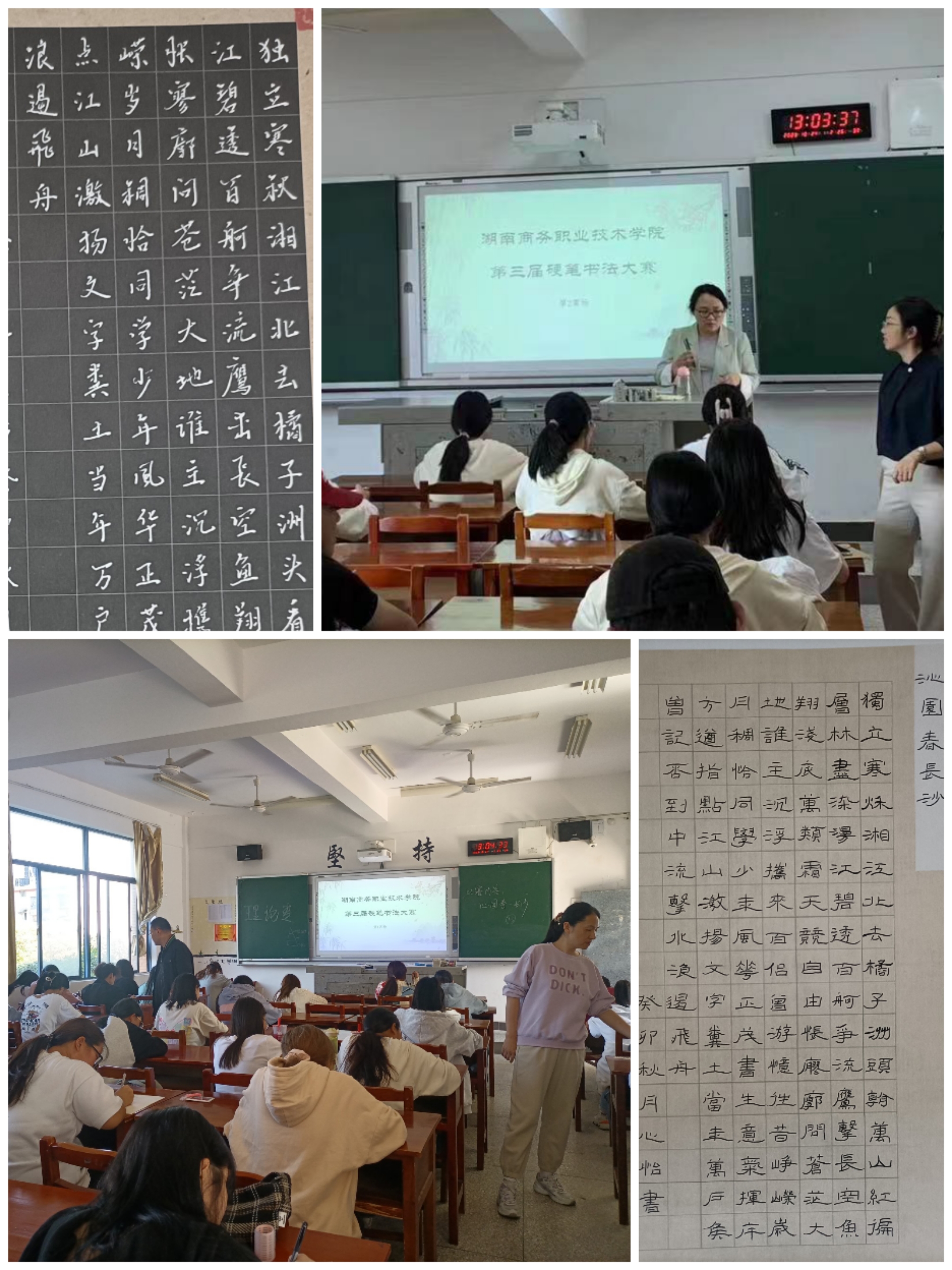 练中华书法,承传统文化。书法作为我国特有的传统艺术,是中华民族智慧的结晶。作为一门独特的传统艺术形式,硬笔书法也在一笔一画的力度和节奏中追求准确与稳定,表达出自我情感和个性特点。为进一步丰富我院校园文化生活,增强学生自觉继承发展中华优秀传统文化的意识,提升本校大学生书法素养,10月24下午,基础课部联合院团委在博思楼举办了湖南商务职业技术学院第三届硬笔书法大赛,并于10月31日中午举行了颁奖仪式。