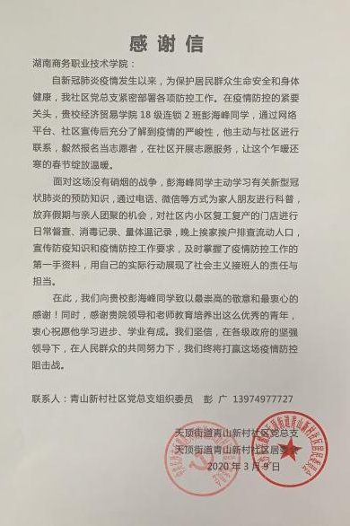 彭海峰同学所在的社区为了感谢他的所作所为特写了封感谢信,并致于崇高的敬意,相信我们终将战胜疫情。