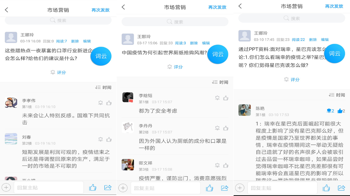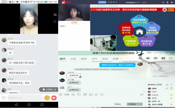 精心挑选教学内容,疫情案例无痕植入。在教学资料的准备过程中,教学团队成员借助各类营销公众号等学习平台搜集大量疫情相关的企业案例,在各知识点中有机融入。如在“需求状态与营销任务”一节授课内容中, 以“病毒感染医疗需求”为例说明负需求概念以及应对措施学生深有感触,在“行业环境分析”内容中用“口罩设备购进”模拟活动来解释买方讨价还价能力就比较容易被学生理解。课后在学习通讨论区中通过播放“转行做口罩暴富”、 “中国疫情引起世界厕纸抢购风潮”、“瑞幸咖啡千里送无人咖啡机” 等新闻来设计与知识点及思政相关思考题引导同学们参与讨论,在知识拓展栏目录制了“2020年新冠疫情后的行业机会”等疫情主题的营销讲座拓宽学生视野同时提高学生职业敏锐度。