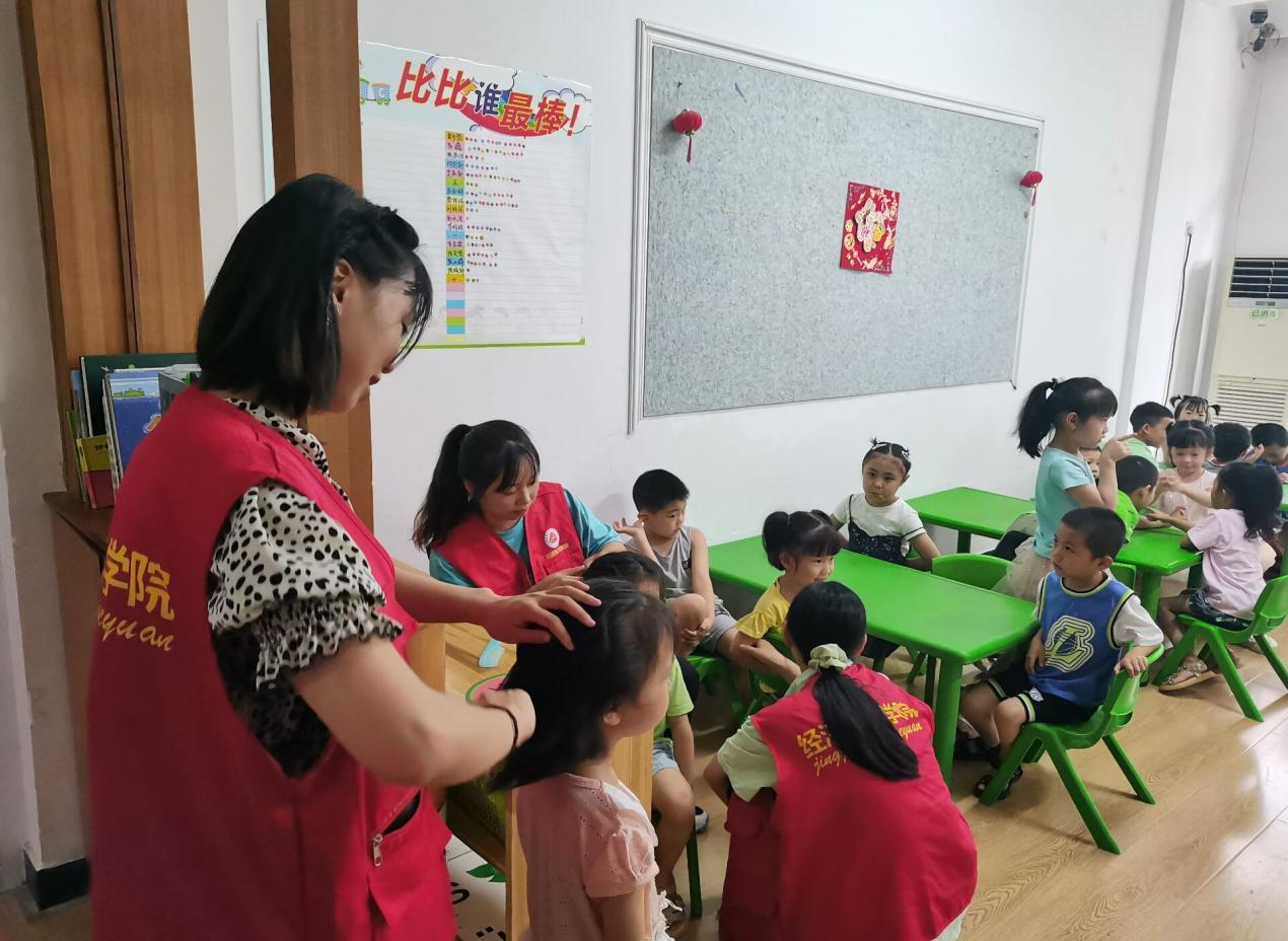 (通讯员 周自立)2021年6月25日下午2:30,经济贸易学院学工党支部志愿者们抵达米奇高幼儿园开展“大手拉小手·一起跟党走”志愿服务活动。志愿者们在园长、老师的带领下见到了一群睡眼朦胧的小朋友。恰逢小朋友们刚刚起床,刘腾等几位同志立马进入了“小老师”的角色,帮助小女生扎头发。“小妹妹,你知道什么是党吗?”“是不是《唱支山歌给党听》里的‘我把党来比母亲啊’?我经常跟着我哥哥一起唱哦。”“小朋友们,你们知道今年是党的多少岁生日吗?”“我知道!我知道!”一名小男孩高高举起手,“100岁。”……“你们真棒!”志愿者们一一给小朋友们颁发奖励的小红花,一堂特别的党史课趣味横生。