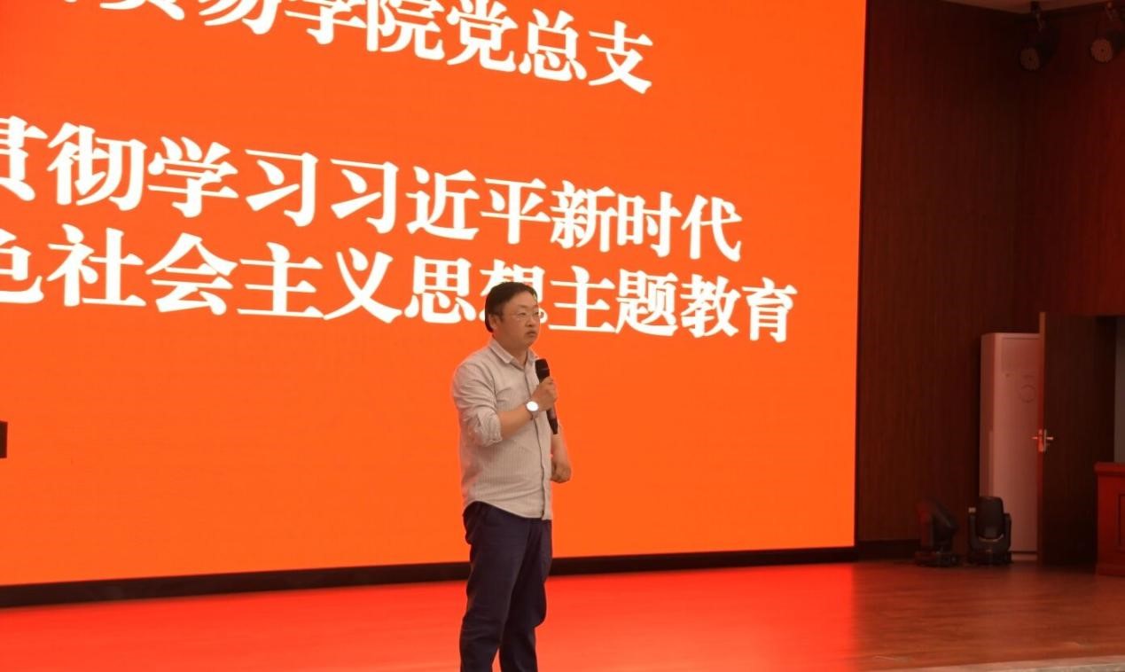 ▲经济贸易学院党总支书记谢立靖做主题教育动员