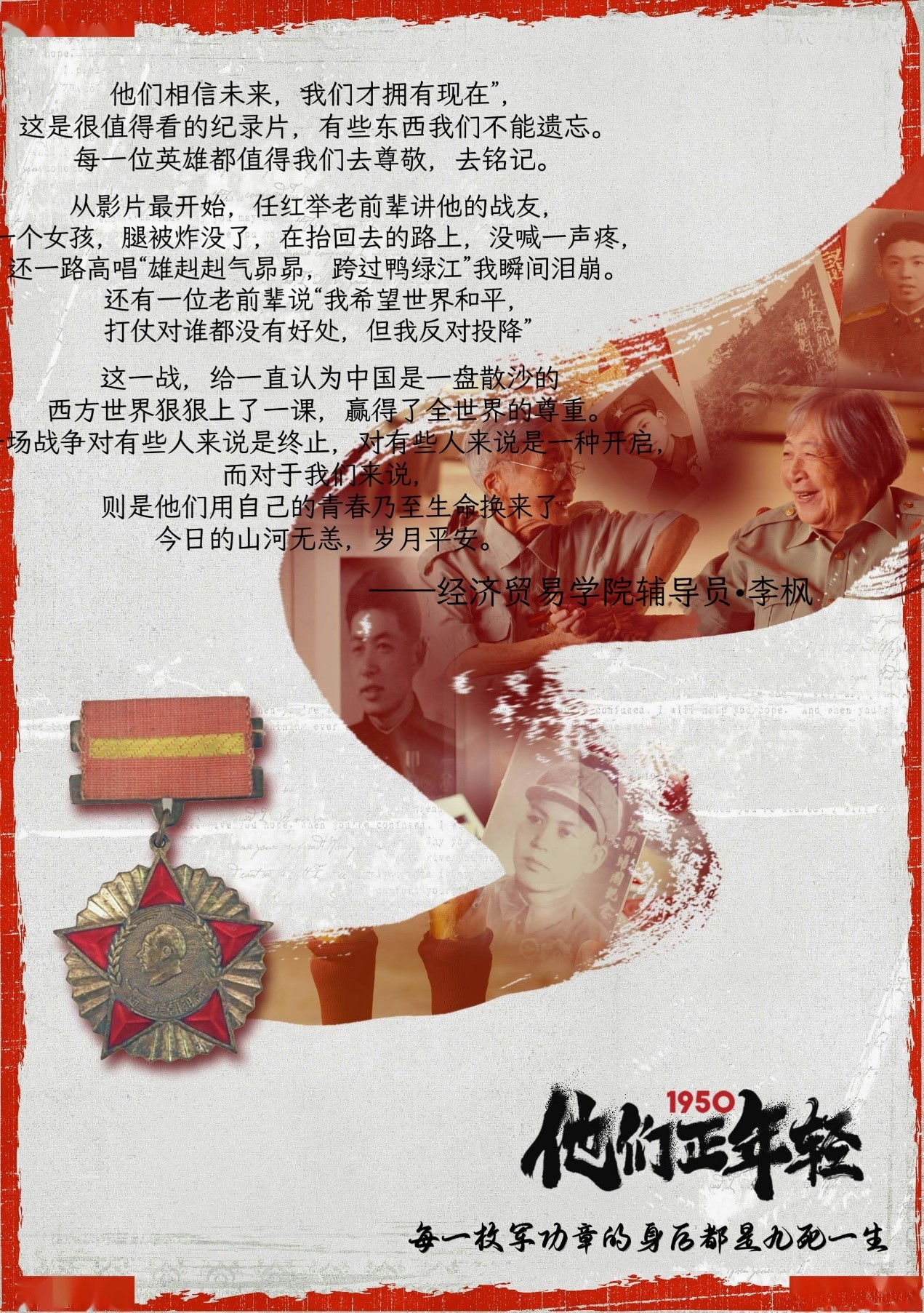 纪录片以采访的形式,用全新的视角聚焦当年抗美援朝的年轻人,通过不同军种,不同时期参战的老兵真人讲述,以一句句平实细微的话语呈现出他们曾经热血的青春与梦想。在《1950,他们正年轻》中,采访的26位志愿军老兵,基本都是90多岁,最年轻的也有87岁了。这些珍贵的影像,对于老人们来说,是一次忆往昔岁月峥嵘的感怀;对于我们而言,他们的故事,让我们进一步了解了那场立国之战的点滴,更深刻地懂得了他们为什么是“最可爱的人”。