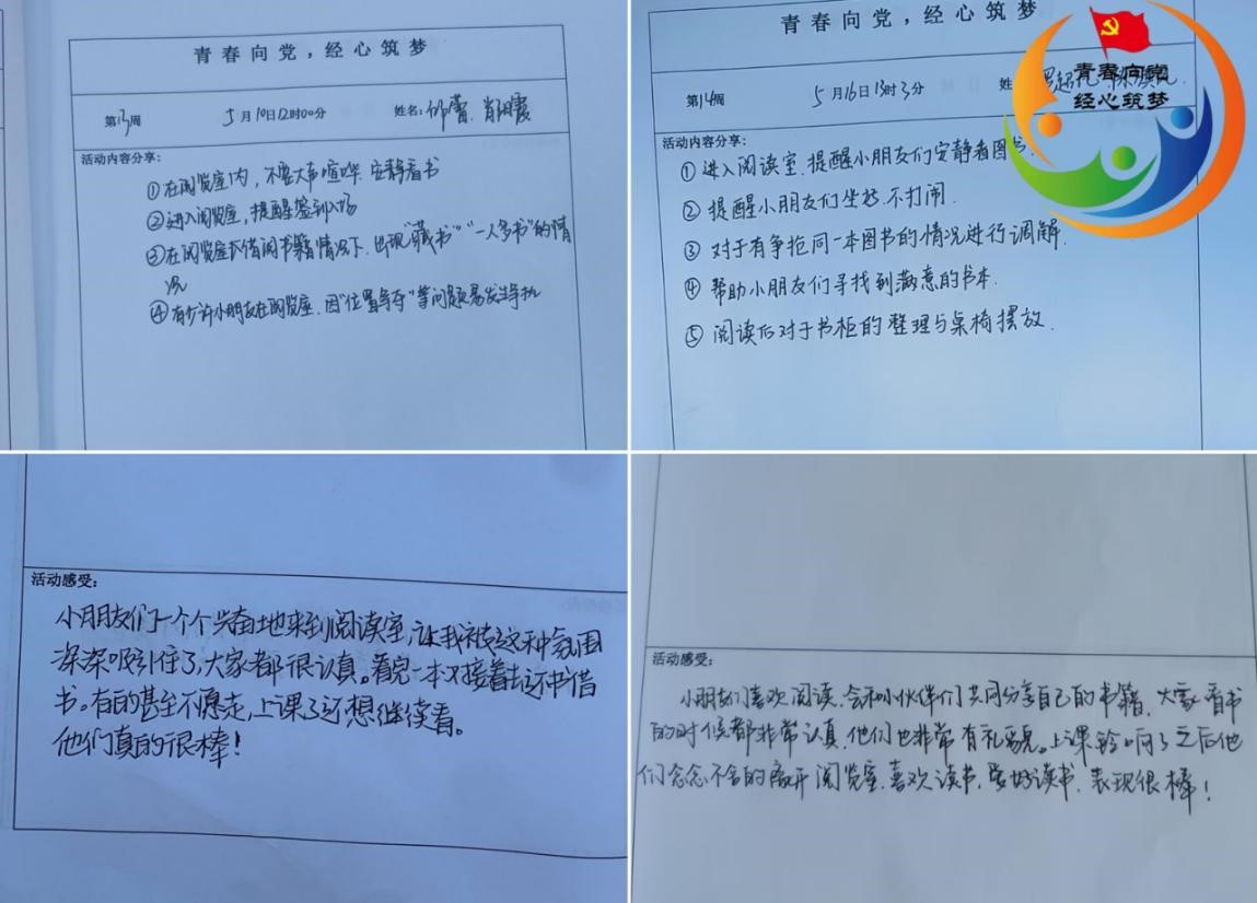 在图书馆里,志愿者们对小朋友需要阅读的图书进行整理,积极引导小朋友们阅读书籍并放回原处,维护图书馆内的阅读秩序。同时,志愿者和家长志愿者积极配合,在阅读时间结束后与家长志愿者一起将图书摆放到正确位置,将地面垃圾清扫干净,给第二天阅读的小朋友们营造一个干净舒适的阅读环境。整理完成后,志愿者们将在本子上记录当天的活动的有关工作注意事项和服务感悟。