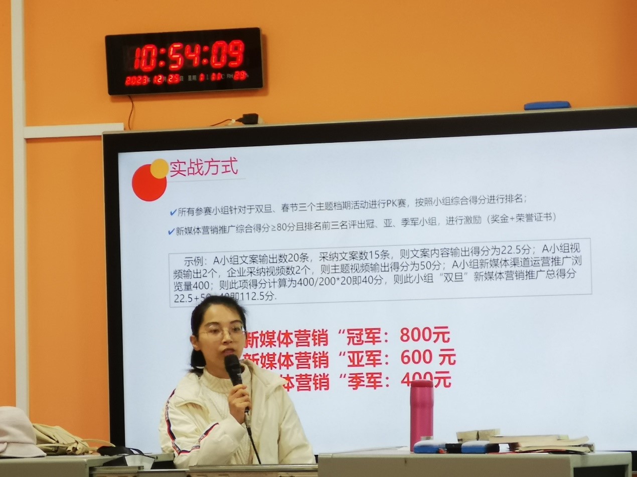周经理从实训时间、活动内容、作品要求、考核评价、活动奖励等方面详细地介绍了“迎双旦 过新年”新媒体营销推广活动,开展了业务培训。