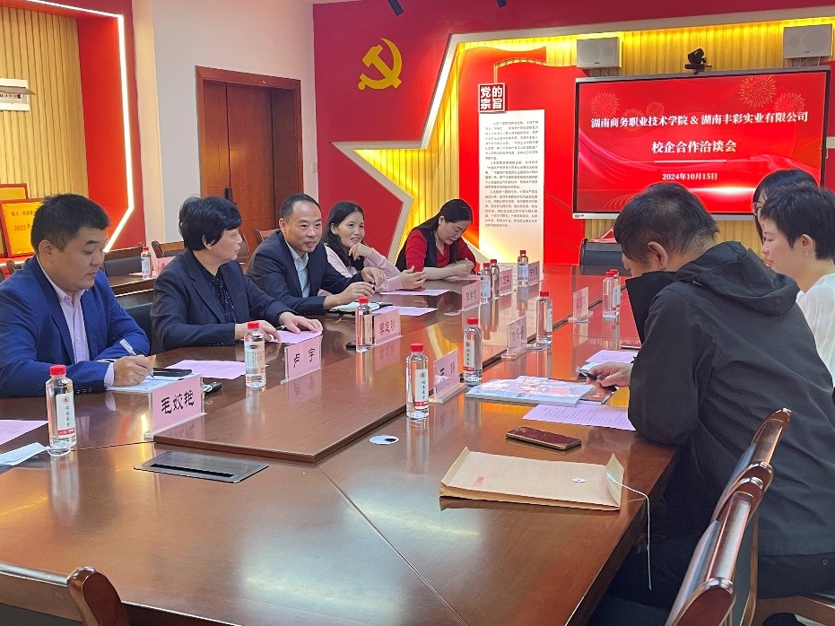 2024年10月15日,湖南丰彩实业有限公司刘琛馨副总经理一行四人来访经济贸易学院进行校企合作洽谈。校企双方就连锁商业发展现状、人才供需、师资与实训基地共享等方面进行深入交流,达成了基本合作框架。