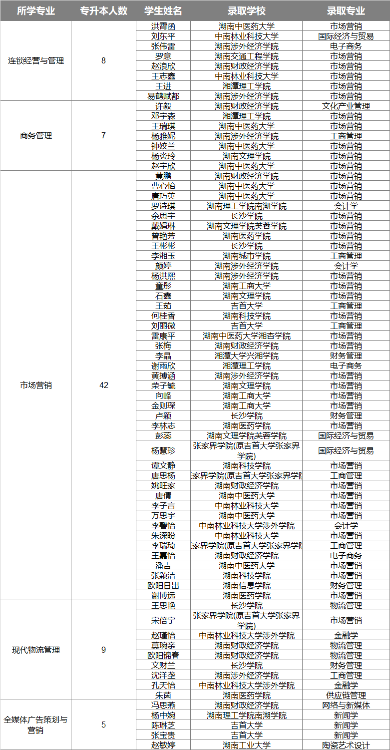夏风送喜,捷报频传。经济贸易学院2025届毕业生专升本录取共71人,占毕业生总人数(618人)的11.49%,其中市场营销专业专升本录取人数42人,录取率为16.21%。各专业专升本情况如下: