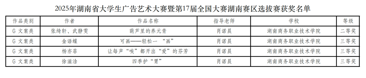 (通讯员 肖诺晨)近日,2025年湖南省大学生广告艺术大赛暨第十七届全国大学生广告艺术大赛(以下简称“大广赛”)湖南赛区选拔赛评审结果揭晓。我校经济贸易学院全媒体广告策划与营销专业学子表现卓越,共斩获省级二等奖1项、省级三等奖3项,且4件获奖作品均成功晋级国赛。