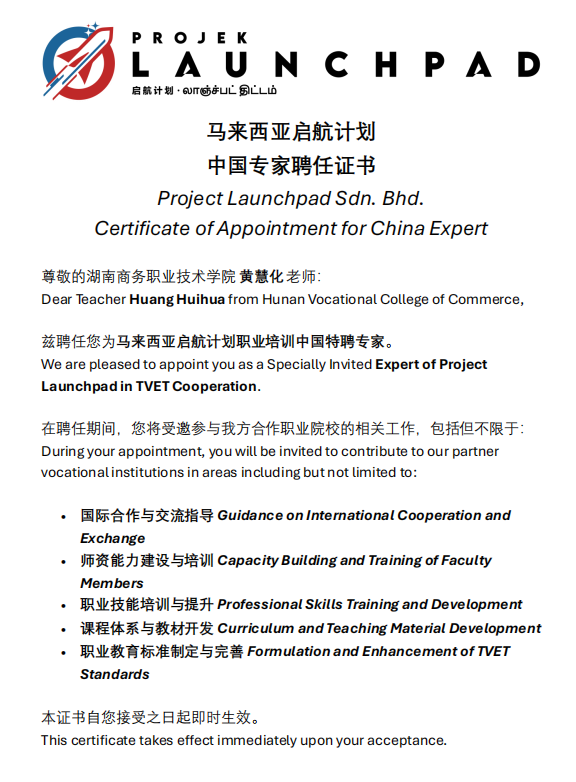 此次专家和课程成功获得马来西亚国家级认证,是学院国际化办学的一项里程碑式成就,体现了学院在职业教育领域的深厚积淀。这不仅是国际社会对学院师资力量和课程建设质量的认可,更是中国职业教育标准“走出去“的生动实践。此次成功的国际认证,为学院国际化发展开辟了新的通道,也为中国职业教育更好地服务“一带一路”建设提供了可资借鉴的范例。