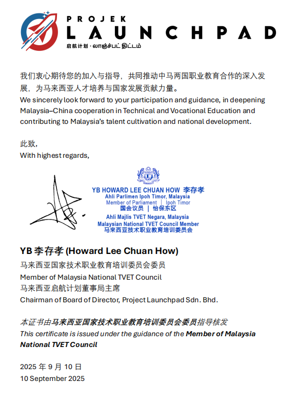 马来西亚“启航计划”是其国家技术职业教育与培训(TVET)体系的重要组成部分,旨在提升本国劳动力的技能水平,以应对全球经济发展的新挑战。本次合作正是积极响应“一带一路”倡议中关于“促进民心相通、加强能力建设”号召的具体行动。