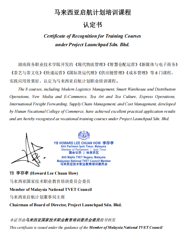 近日,经济贸易学院在国际职业教育合作领域取得重大突破,陈学忠、黄慧化、禹海慧、辛磊、成莹洁、朱波、李园、彭庆、卢宇、毛斑斑、钱秋兰等11位教师正式被马来西亚国家技术职业教育培训委员会(Member of Malaysia National TVET Council)认定为“马来西亚启航计划职业培训中国专家”。这11位教师均在各自专业领域拥有丰富的教学和实践经验,他们将作为中国职业教育的代表,为马来西亚“启航计划”提供专业的培训、咨询与指导。同时,学院开发的《现代物流管理》《智慧仓配运营》《新媒体与电子商务》《茶艺与茶文化》《快递运营》《国际货运代理》《供应链管理》《成本管理》等8门优质课程也同期获得该委员会认证,纳入马来西亚“启航计划”职业培训体系,直接服务于马来西亚技术技能人才的培养,助力其产业升级和经济发展。