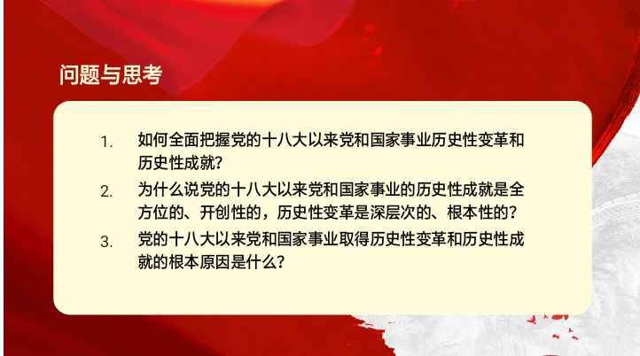 首先,刘梦倩同志以习近平总书记在中国共产党第十九次全国代表大会上作的报告中的“五年来的成就是全方位的、开创性的、五年来的变革是深层次的、根本性的”为主题向党员同志们提出问题:为什么说党的十八大以来党和国家事业历史性成就是全方位的、开创性的,历史性变革是深层次的、根本性的?接下来,刘梦倩同志对于这个问题进行了解答,她回答道:这些历史变革的力度之大、程度之深、范围之广、成效之显著,在党的历史上、在新中国的历史上、在中华民族发展史上都具有及其重要的意义,必将对中国特色社会主义事业的发展产生全局性和根本性的影响。最后,刘梦倩同志以“九个变革”“四个意识”作为铺垫,阐述了习近平新时代中国特色社会主义思想的科学指引作用与重要性。号召全体党员同志紧跟党的脚步,倍加珍惜党的成就、变革以及历史经验,积极作为。
