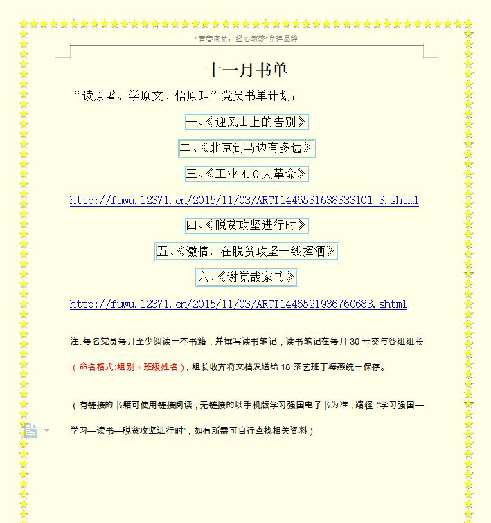 (通讯员:向俊霖)为更好的保持学生党员的思想活力,进一步推行“以书养性,以德修身”的理念。2020年11月,经济贸易学院学工党支部组织全体党员、18、19级入党积极分子开展了第八期“读原著、学原著、悟原理”党员书单计划活动。
