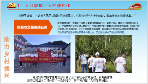 在学习中国式现代化的五大特征时,主持人以我支部组织举办的一系列活动为例号召大家积极参与中国式现代化新道路建设。例如暑期三下乡社会实践活动中为炎陵黄桃助力,引导大学生为乡村振兴贡献才智;走进湘仪社区养老中心开展的“青春伴夕阳”活动,传承尊老敬老的传统美德,加强了当代大学生的精神文明建设,推进物质文明与精神文明相协调的现代化。