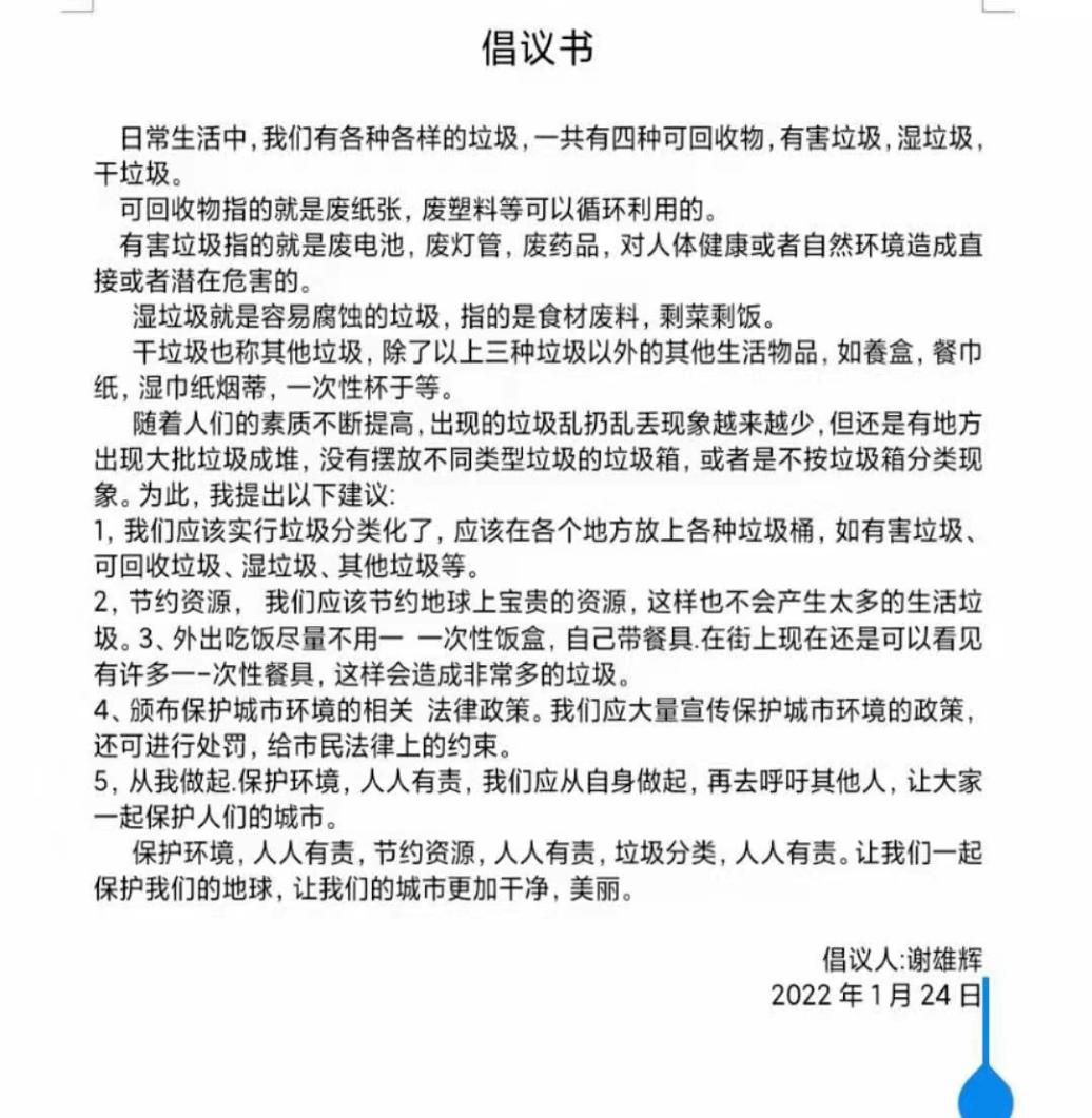 ▲谢雄辉同学书写的“垃圾分类”倡议书