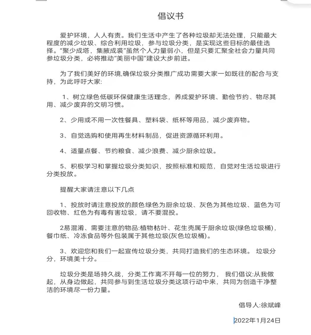 ▲徐斌峰同学书写的“垃圾分类”倡议书