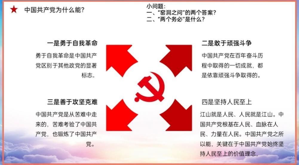 以人民为中心的发展思想,深深植根于中国共产党的血脉之中,中国共产党不仅是这样说的,关键在于也是这样做的。在百年奋斗历程中,从雷锋、焦裕禄到张桂梅、卢永根……在一个个耳熟能详的平凡而伟大的人物身上,无不闪耀着“为人民服务”的光辉。正是因为中国共产党人矢志不渝地为人民利益而奋斗,赢得了广大人民群众的认可和支持,为中国共产党创造一切成就提供了最为广泛的依靠力量。最后,主持人以提问的方式回顾了本次党日活动所学的知识。大家对“中国共产党为什么能?”进行积极的讨论。“敢于自我革命、敢于顽强斗争、善于攻坚克难、坚持人民至上。”“作为新时代的新青年,我们要积极传递为人民服务的正能量,拾金不昧、随手捡起地上的垃圾、参加抗疫志愿者……一件件小事,都因为为人民服务、忘我奉献变得不平凡。”“只有让人民来监督政府,政府才不敢松懈。只有人人起来负责,才不会人亡政息。”……弹幕不断。