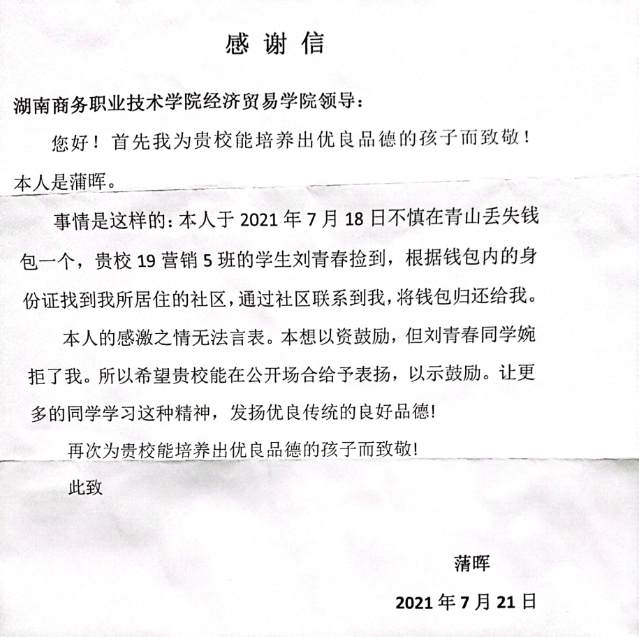 2021年7月18日,经济贸易学院市场营销专业19级学生刘青春同志,在下班赶回学校的路上,路过雷锋大道青山时代店并在此处捡到一个黑色钱包。捡起钱包乍一看,里面有现金若干元、4张银行卡、身份证等物品。刘青春同志通过身份证上面的信息了解到,钱包丢失者居住在自己曾经做过志愿服务的湘仪社区,随后,他立即联系了湘仪社区养老院的志愿者王吟女士,通过王女士的连接纽带作用,他在7月20日联系上了失主蔳辉先生并亲自前往湘仪社区将拾到的钱包物归原主。看到失而复得的钱包,蔳先生很激动,连忙向刘青春同志致谢。他本想用一笔小钱来感谢刘青春同志的善举,但是最终被他婉言谢绝:“作为一名预备党员和志愿者,我只是做了自己力所能及的事情,有一分热发一分光,赠人玫瑰,手有余香,能帮助到您我也很开心,将所拾之物还给失主,这是我应该做的,不应该接受任何物质奖励。”蔳先生在听了刘青春同志的一番话后,决定不再勉强用物质作为奖励,所以在7月21日写了一封感谢信,寄给了湖南商务职业技术学院经济贸易学院,以表感谢之情。
