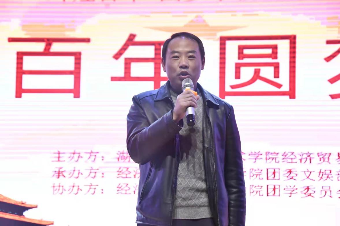 随后,经济贸易学院院长陈学忠老师寄语新生:“我们今天晚会的主题是‘辉煌百年,圆梦今朝’。此次晚会一是为了迎接新生的到来,二是为了向党献礼。希望同学们在未来的三年里做到心怀理想,心怀诗和远方,同时不要好高骛远,根据现实情况树立人生理想。心走快了会迷失方向,脚走快了会摔跤。大家要脚踏实地,跟着自己的内心前行,哪怕只有一小步,也不能忽视。在此,我呼吁同学们行动起来,把人生路走得踏实,走得扎实,结出累累硕果。”