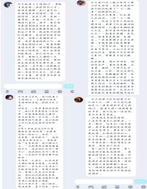 观影结束后,大家积极参与小组讨论并撰写学习心得。“青春向党”入党积极分子先锋营第十党小组20级连锁2班的周丽娜同学讲到:“看完整个影片后,我感受最深的是‘平凡铸就伟大,榜样来自人民。’他们不是生来就能成为别人的榜样,而是通过不断地努力,不断地提升自己,不断地服务社会,最终才成为了令人敬佩的英雄。这些英雄都有一个共同点,他们舍弃了自己的小家,去爱我们的国家,默默坚守岗位,从不抱怨,为中国的建设和发展打牢基础,他们是最值得我们学习的榜样。”
