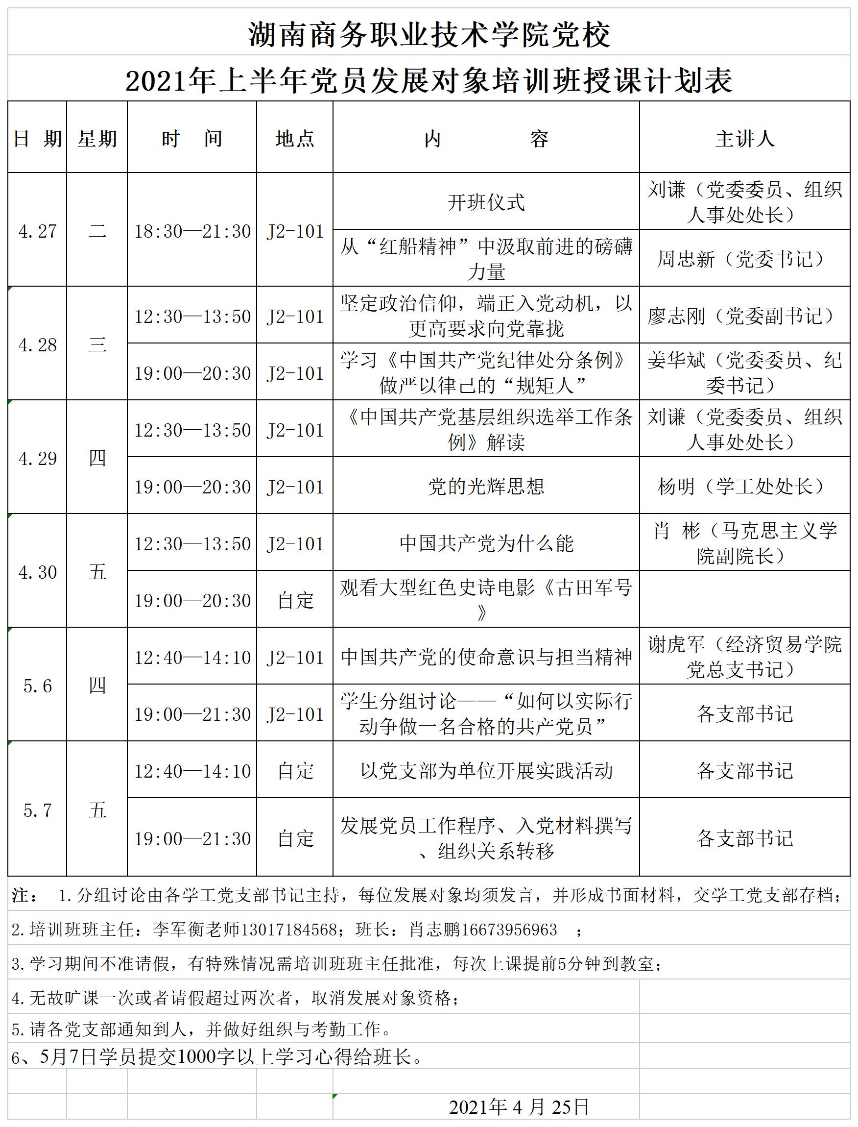 湖南商务职业技术学院党校2021年上半年党员发展对象培训班授课计划表
