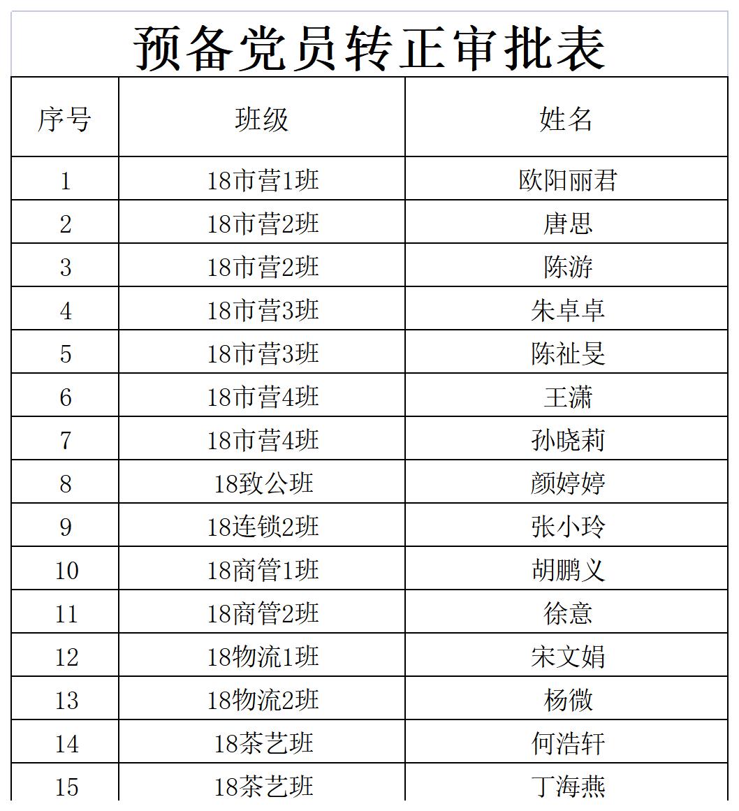 在听取党小组和党员、群众意见的基础上,经支部委员会审查,拟将欧阳丽君等15名同志转为中共正式党员。报据发展党员工作有关要求, 现将其有关情况公示如下: