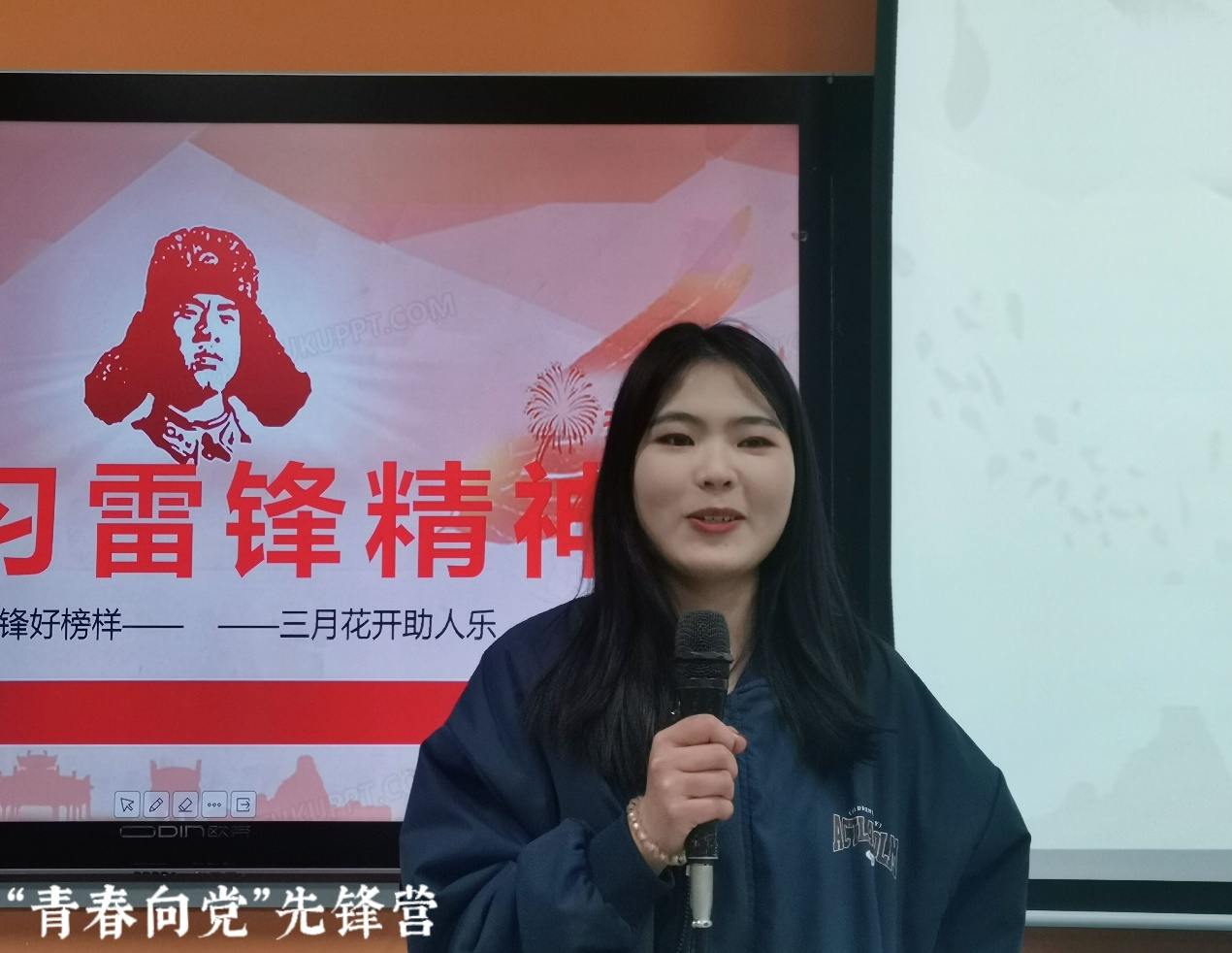 随后,周婷同学带领大家重温了雷锋用行动践行为人民服务的宗旨的故事。“人的生命是有限的,但为人民服务是无限的,我要把有限的生命投入到无限的为人民服务中去。”雷锋日记中的这句话完美诠释了生命的意义不在于长短,而在于对社会的贡献。无数挺身而出的抗疫战士们、抗洪救灾的志愿者们,他们立足本职、默默奉献,个个都是活雷锋,他们把自己奉献给社会,用行动践行着雷锋精神。