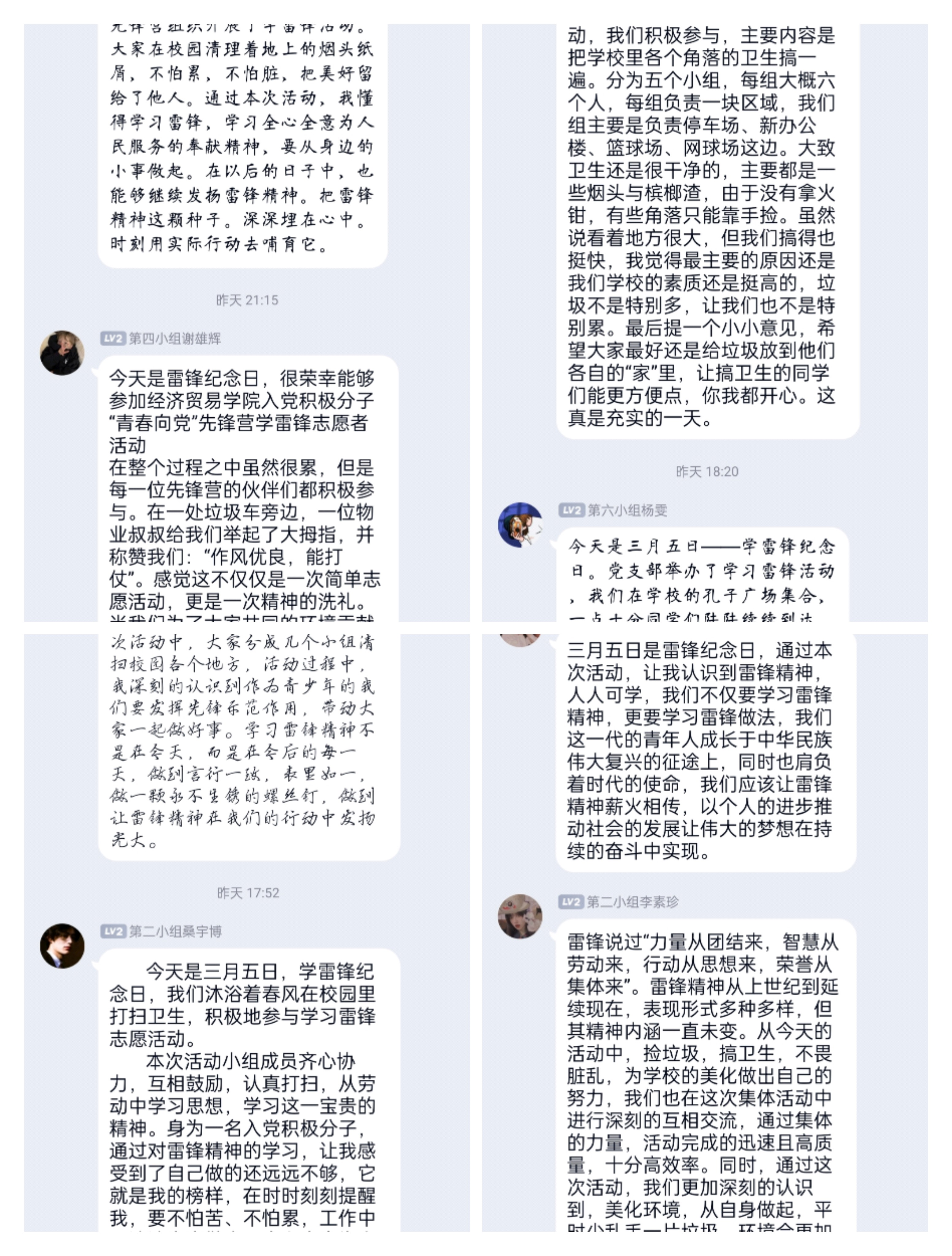 时代在发展,社会在变化,但雷锋精神永不过时。活动结束后,不少同学积极发表参加活动的感悟。“我们要严格要求自己,始终保持着先进带头作用,不断刻苦学习,求真务实,让雷锋精神在新时代青年群体中继续继承与发扬!”“学习雷锋精神不是在今天,而是在今后的每一天,我们要做到让雷锋精神内化于心、外化于行。”“垃圾入桶,从我做起,在日常生活中养成良好美德,让雷锋精神潜移默化的影响到身边人。”……