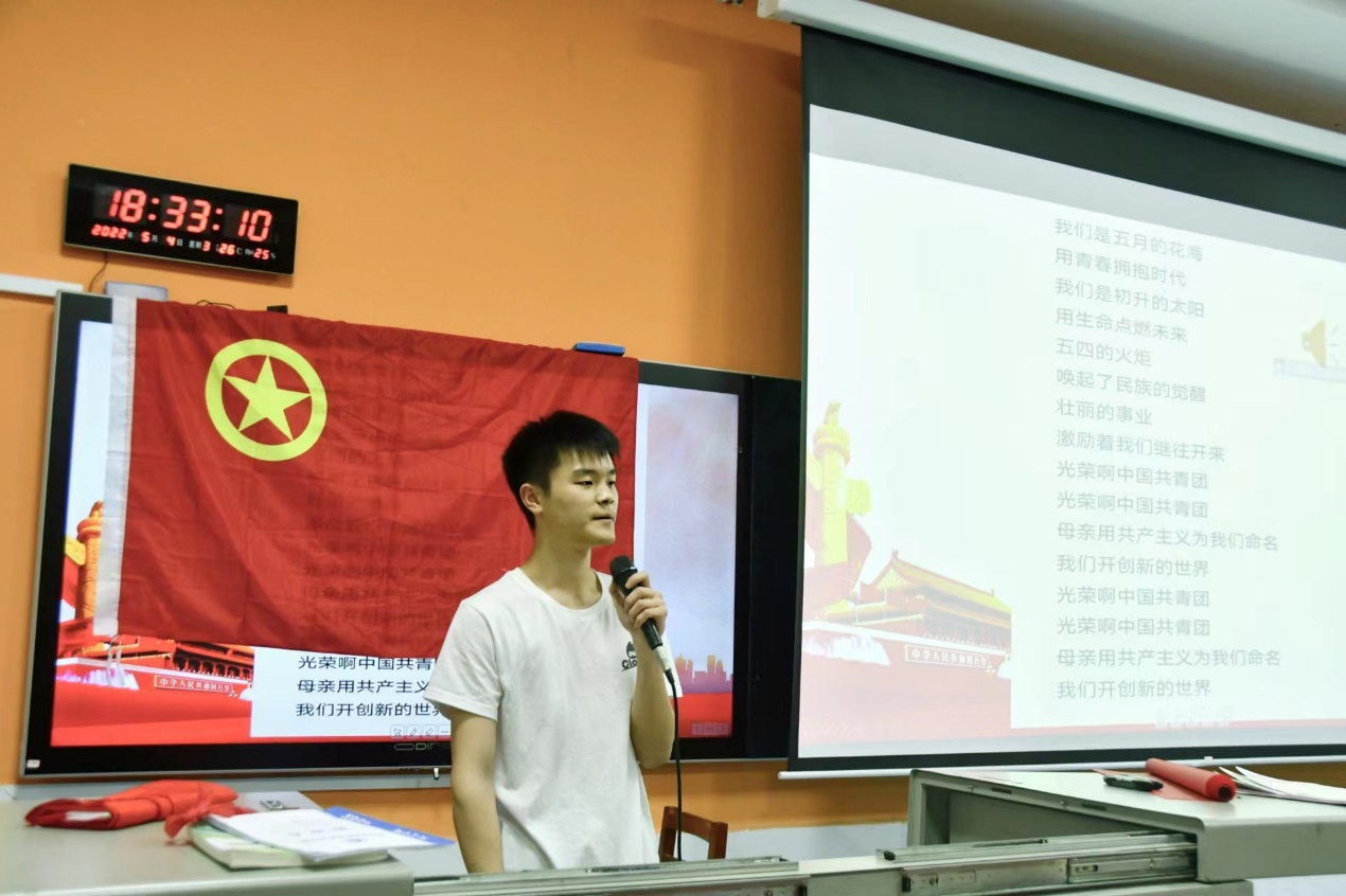 活动第一项,唱团歌。同学们用满腔的热血和嘹亮的歌声庆祝光荣的中国共产主义青年团建团100周年。随后,主持人就“什么是五四精神”这个问题组织同学们进行了谈论,进一步加深了同学们对“五四精神”的认识。