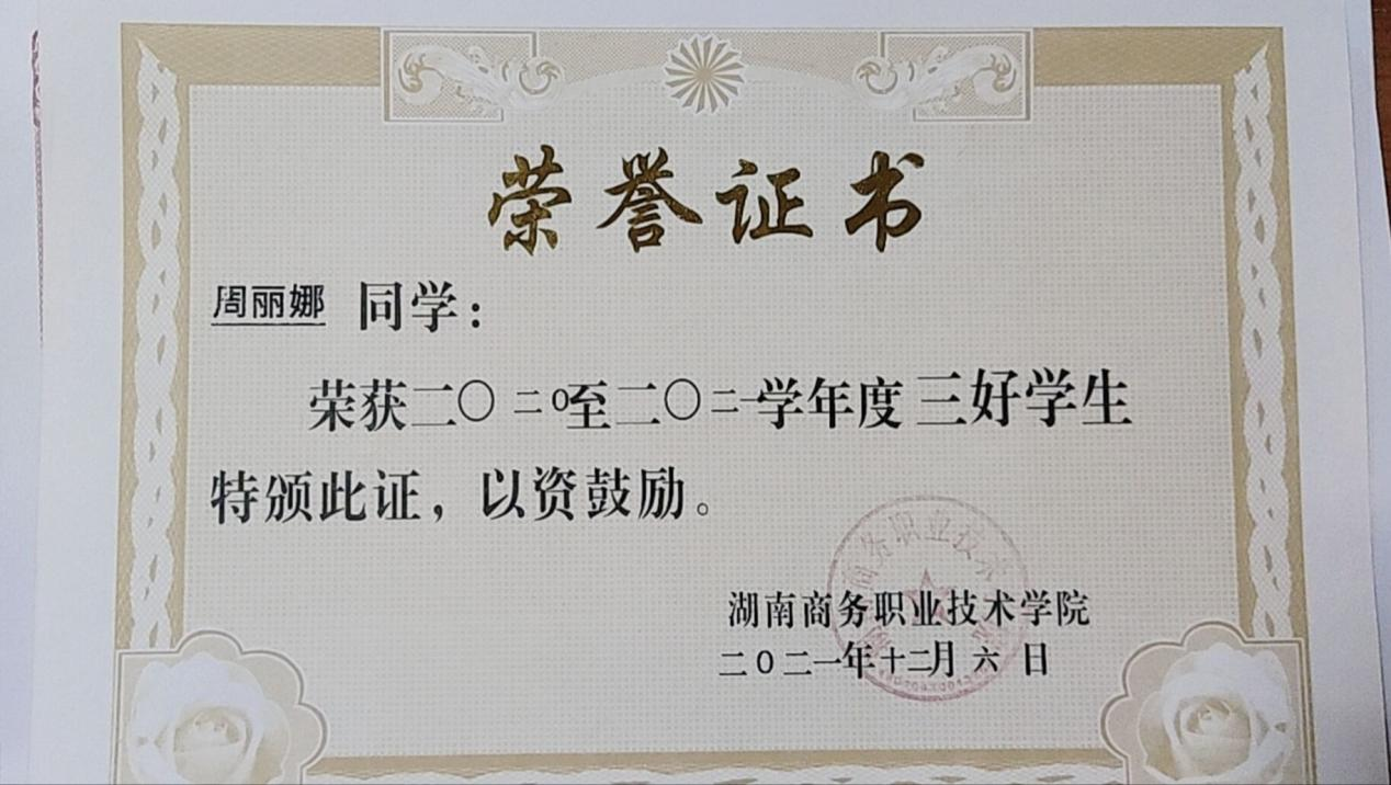 ▲周丽娜荣获年度三好学生荣誉证书